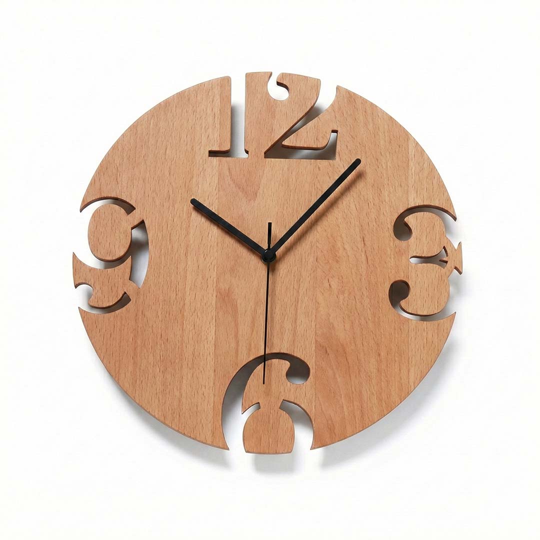 Na rozdiel od klasických plných ciferníkov sme pri tomto modeli zvolili odvážnejší prístup. Hlavné číslice (12, 3, 6, 9) sú priamo vyrezané do okrajov bukového dreva. Tento detail vytvára nádhernú hru svetla a tieňa na stene za hodinami a dodáva im ľahkosť. Teplý odtieň bukového dreva v kombinácii s minimalistickými čiernymi ručičkami zaručuje, že sa hodiny hodia do moderných aj škandinávskych interiérov.